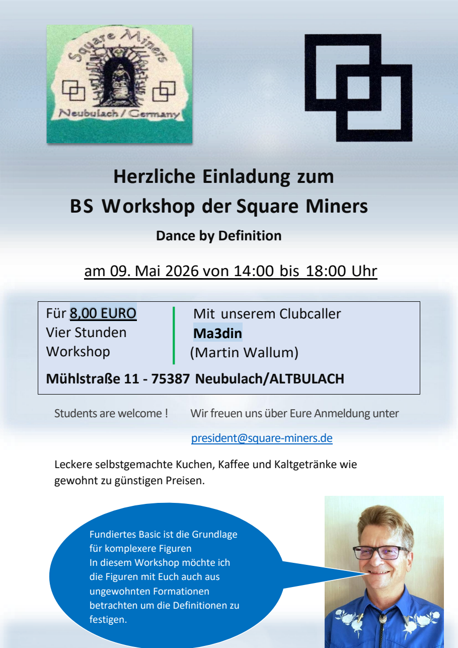 04.-07. | WS | C1 (+C2+C3a) Workshop | Flyer | 92266 Ensdorf | C1, C2, C3A | ACR Square & Round Dance Club e.V. Leader: David Heffron | +49 176 83720464 |