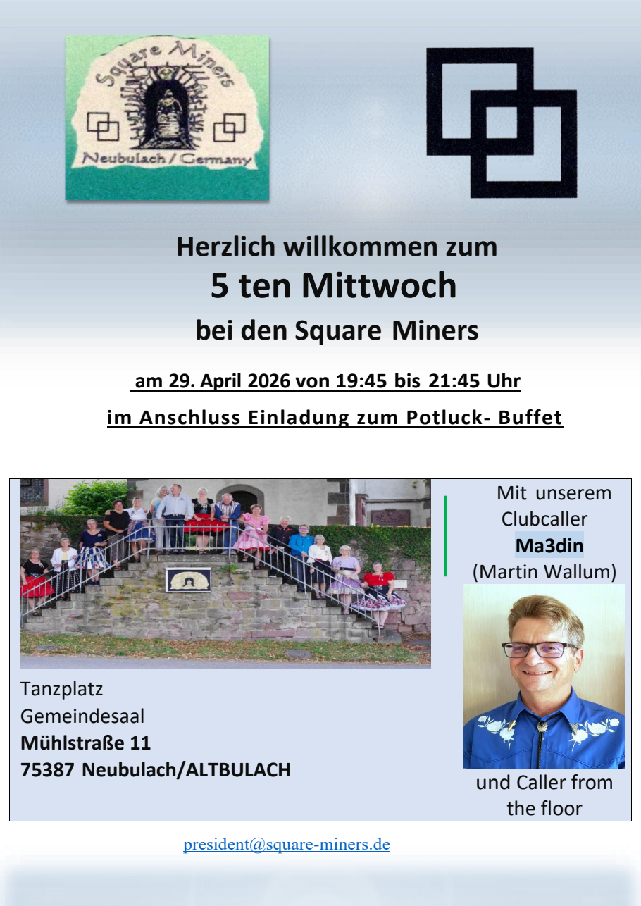 | 63517 Rodenbach | MS, PL | Rodenbacher Square Dancers Leader: Tommy Schneeberger, Keith Haigh (MC) | Richard Neumann, 06184-55465 |